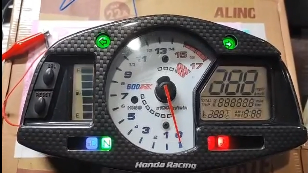 作業台の上に置かれた、ホンダ CBR600RR の純正メーター。