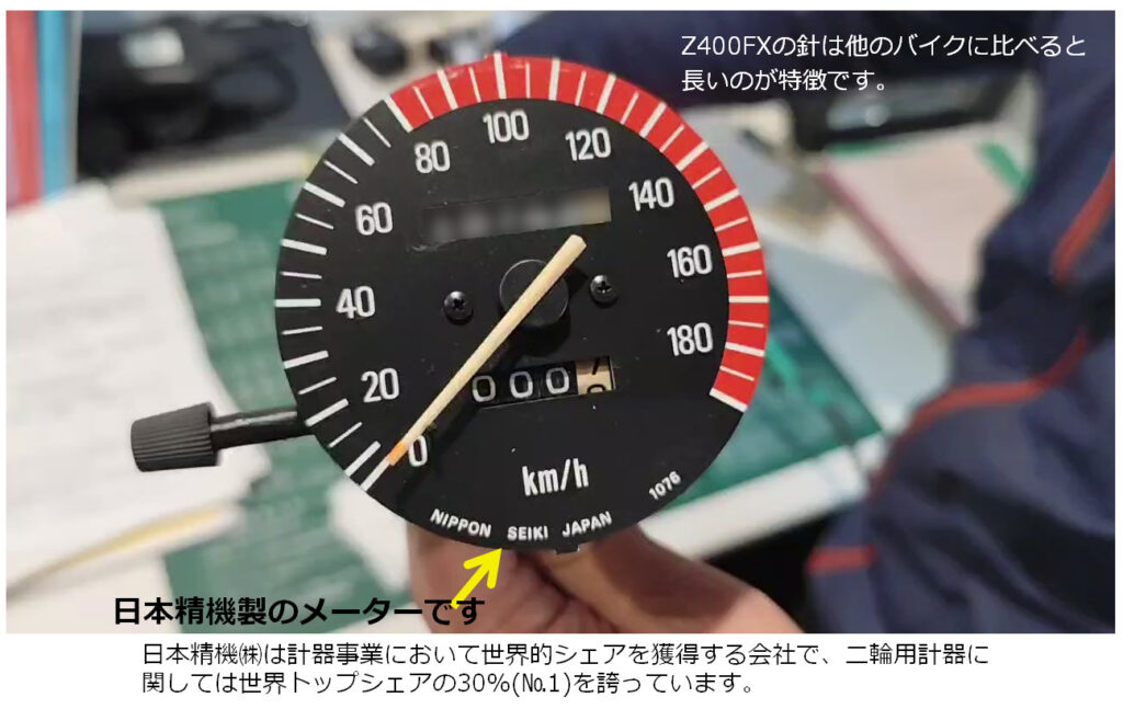修理(オーバーホール)後は、Z400FX本来の滑らかで旧車メーターらしい味のある静か(滑らか)な動きが戻りました。