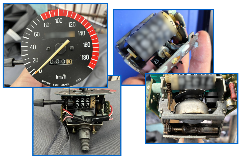 針とオドメーター/トリップメーターの両方に不具合が生じているのであれば、入力軸までに何らかの原因が考えられますが、今回は針の振れだけですので、内部ダンパー系(機能)が原因と診断する事が出来ます。